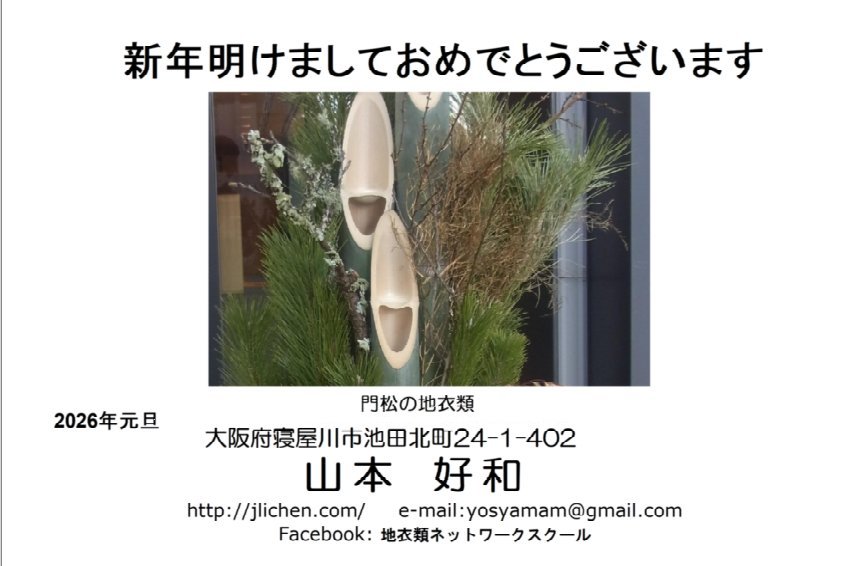 2026.1.1--旧年中はお世話になりました.本年も宜しくお願いします.昨年は年末に地衣類上級編 「日本の地衣類-日本産地衣類の全国産地総目録-」初版改訂版を発行することができました.地衣類観察会をひさびさ沖縄で開催することができました.また,地衣類ネットワークスクールでは地衣学講座および地衣分類学初級講座も開催することができました.今年は「京都地衣散歩」の発行と「地衣類初級編第3版」の発行を目指したいと思っています。講座は新たに地衣生態学初級講座の開催を考えています.気力と体力の続く限りにおいて,地衣学関連書籍の発行や観察会も講義も続けていきたいと思っています.