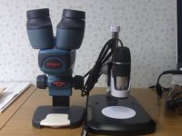 地衣類観察ツール ファーブル(左)とデジタル顕微鏡(右). 自宅で地衣類の同定に大いに役立っています.ファーブルは実体顕微鏡ほどの倍率は望めませんが,まず手軽で簡単に地衣体を拡大して見ることができます.場所をとりませんので,自宅の3畳の我が書斎兼実験室にぴったりです.もちろん,必要なら野外に持ち出すことも可能です.デジタル顕微鏡はパソコンに直結して,パソコンで画面を確認できます.ピント調節が難しいですが,実体顕微鏡並みの倍率が稼げます.なにより,画面を保存できることと長さを測ることができることで重宝しています.同定する上でまつ毛や偽根,子器径など結構長さの情報は必須なのです.